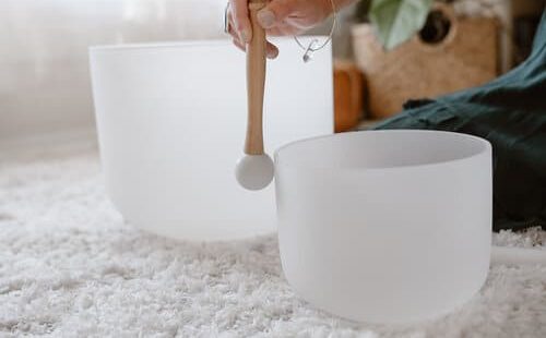 Crystal singing bowls are traditionally white frosted bowls made from 99.992% pure crushed quartz and heated to about 4000 degrees in a centrifugal mold. They come in a variety of sizes, notes, and frequencies, correlating to different chakras or energy centers in the body. Played with a mallet around the rim, with consistent pressure and movement, beautiful, heavenly, sometimes cosmic sound waves are created.